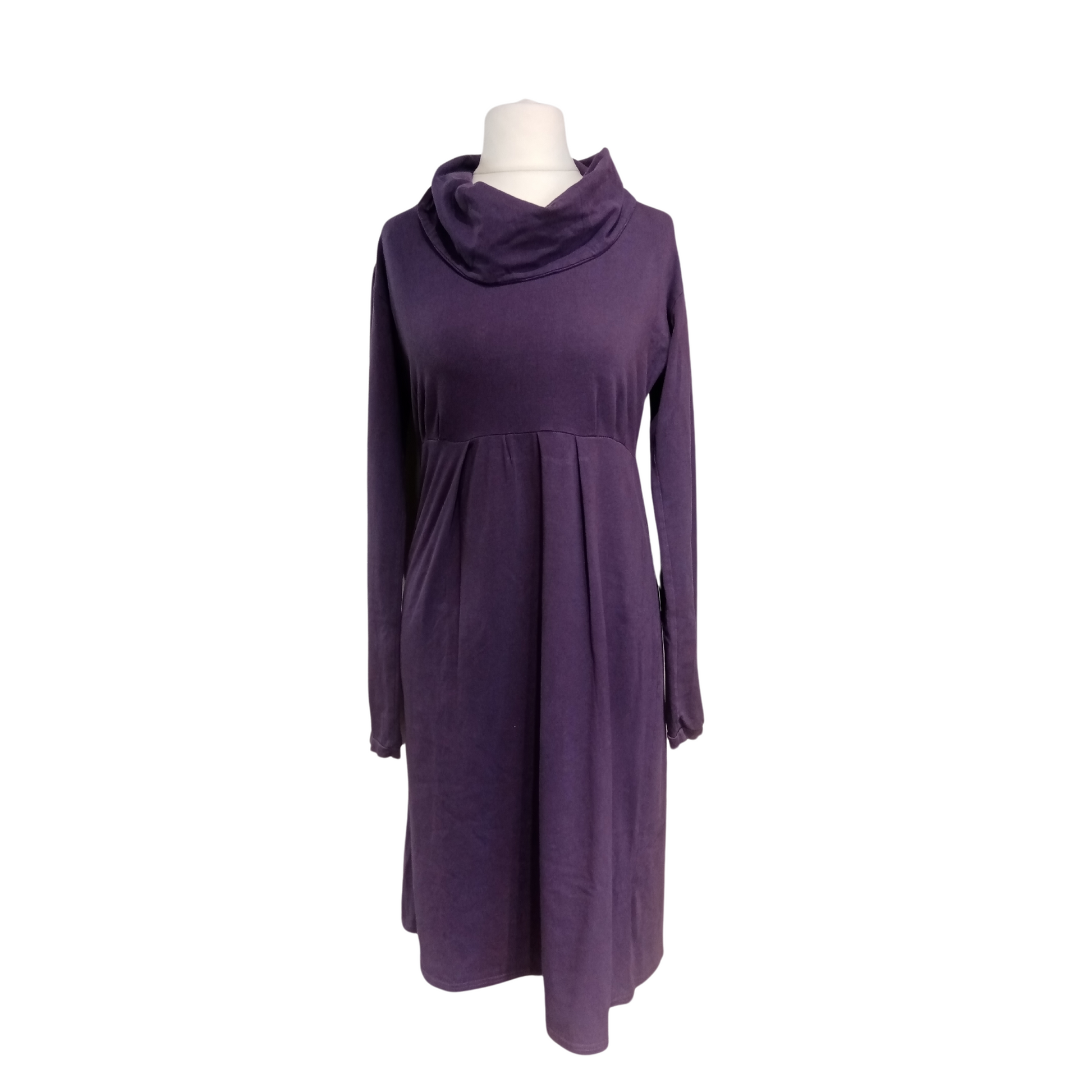 Abito viola con collo a ciambella, morbido, taglio impero.