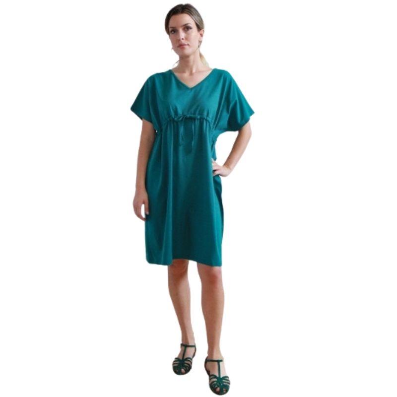 Abito corto da donna in morbido jersey di cotone biologico fiammato, leggero, traspirante e delicato sulla pelle. Il modello presenta uno scollo a V, maniche corte ampie e una linea fluida con coulisse regolabile in vita, che valorizza la silhouette garantendo comfort e libertà di movimento.