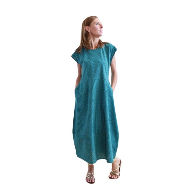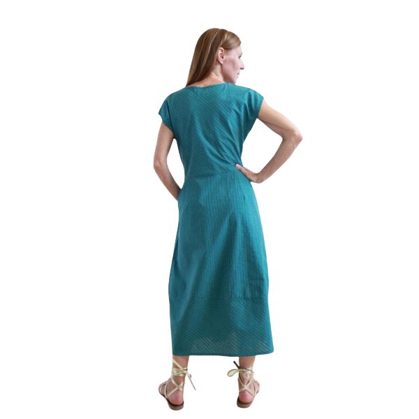 Fresco, leggero e naturalmente elegante, questo abito lungo è realizzato in cotone seersucker e confezionato artigianalmente in India secondo i principi del commercio equo e solidale. La particolare texture increspata del tessuto favorisce la traspirazione e dona movimento al capo, rendendolo ideale per la stagione calda.