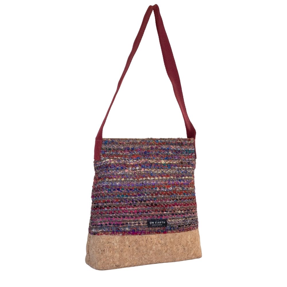 Borsa a spalla e a tracolla in sughero, cotone e seta riciclati, chiusa con zip. Minuteria color canna di fucile.