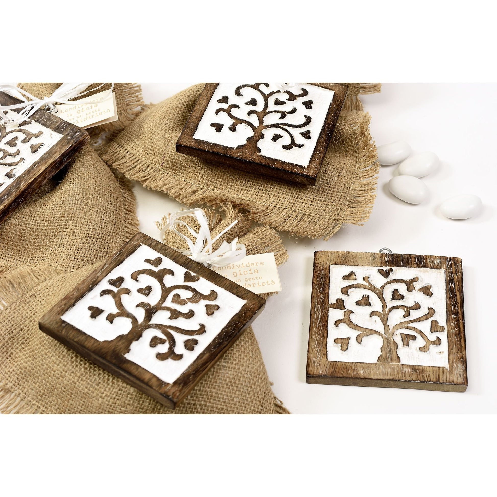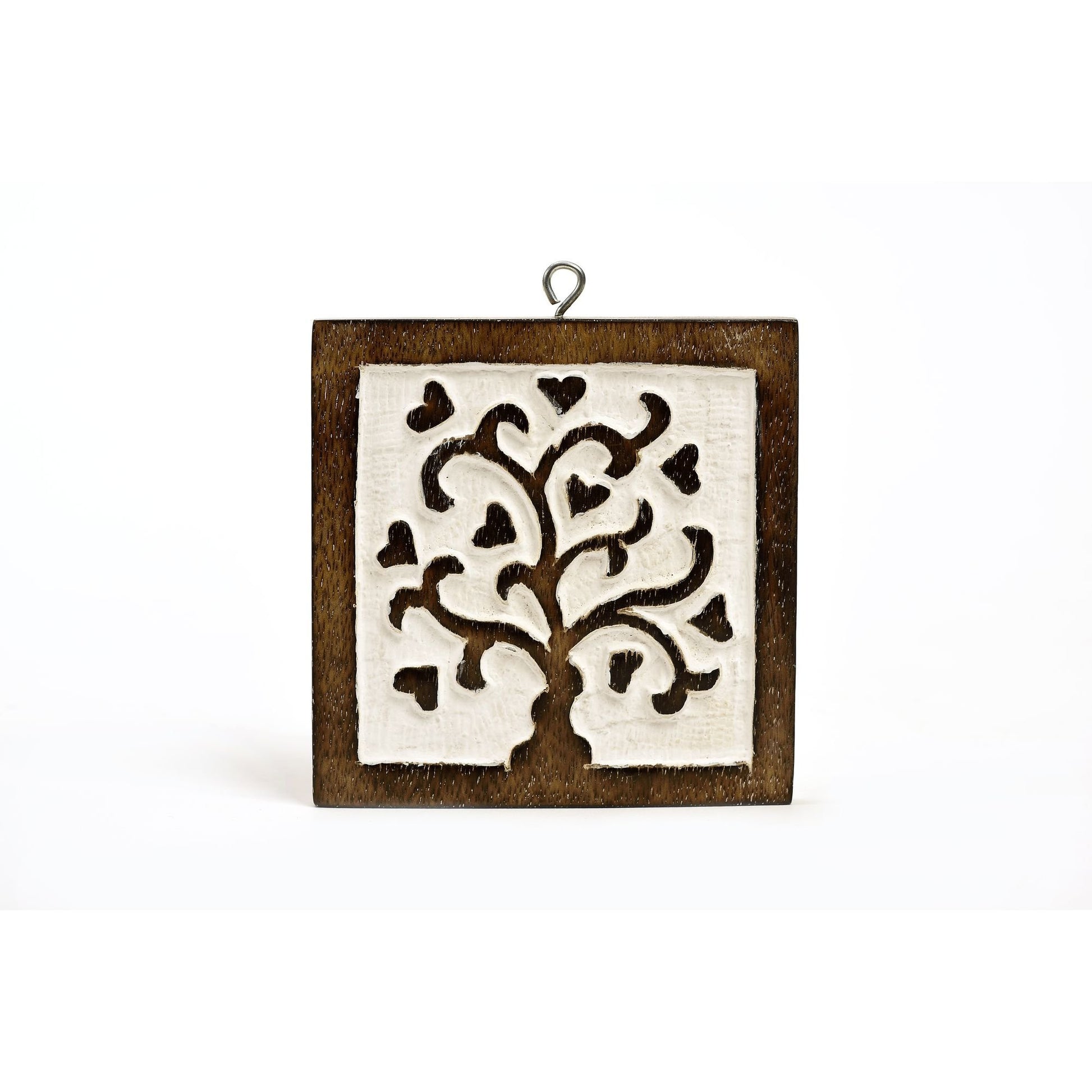 Il simbolo dell'albero della vita inciso a mano su questo piccolo blocco in legno di mango, lo rende un'idea regalo perfetta come bomboniera per festeggiare le occasioni più importanti dal matrimonio al battesimo. Un augurio di prosperità e nuovo inizio unito alla funzionalità. Il gancino in acciaio permette di appenderlo e renderlo anche un piccolo quadretto decorativo.