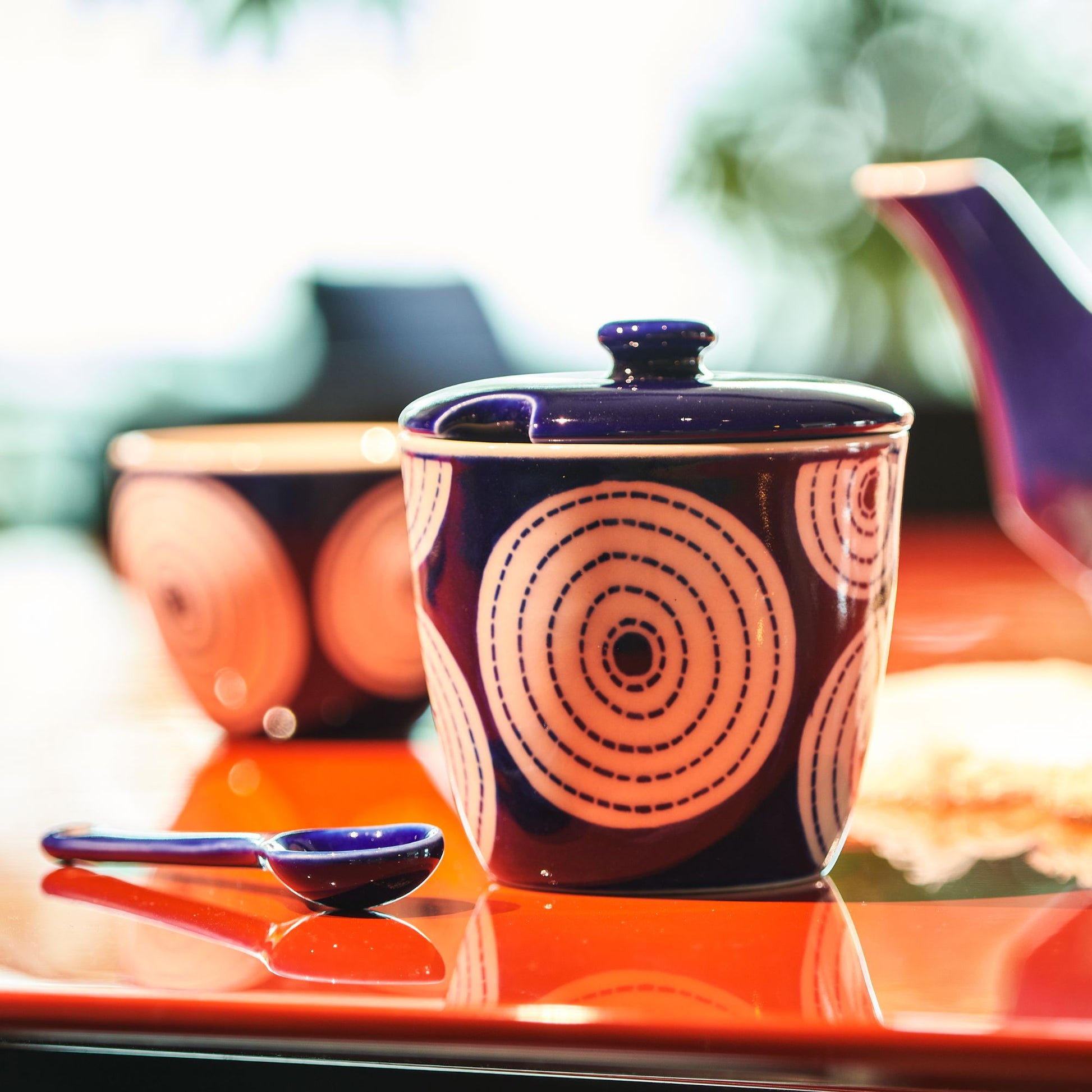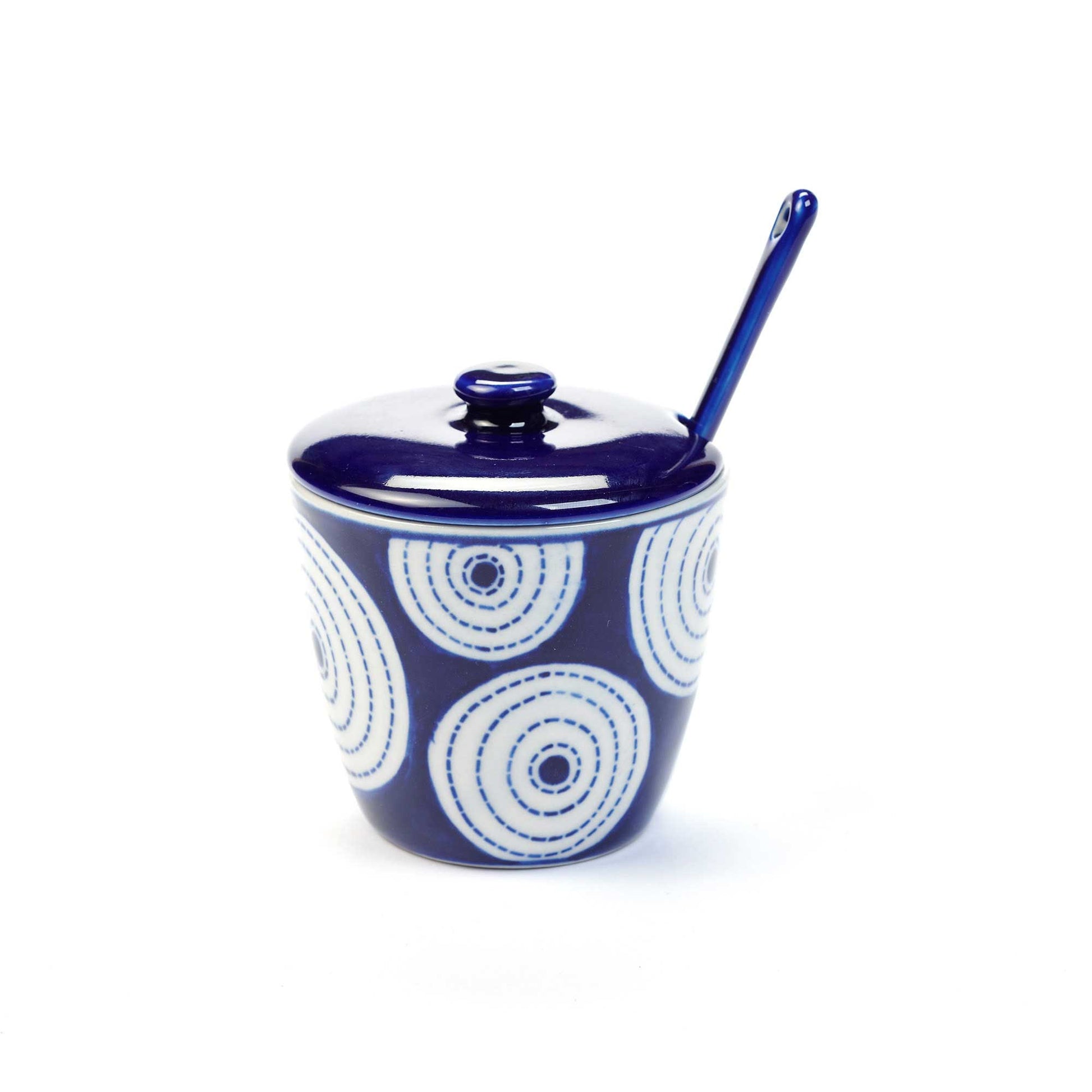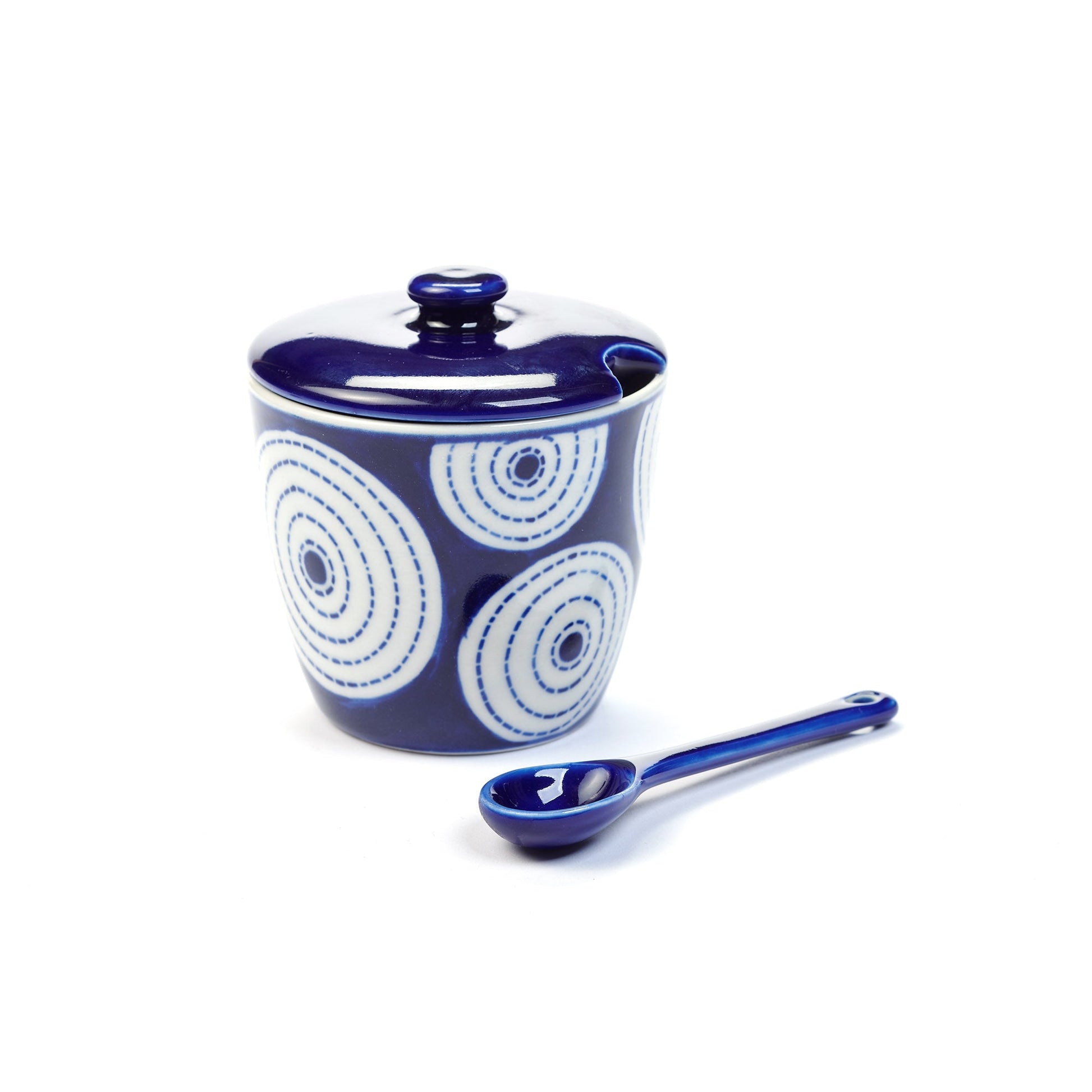 Zuccheriera sorgenti con cucchiaino in ceramica, color blu e bianco